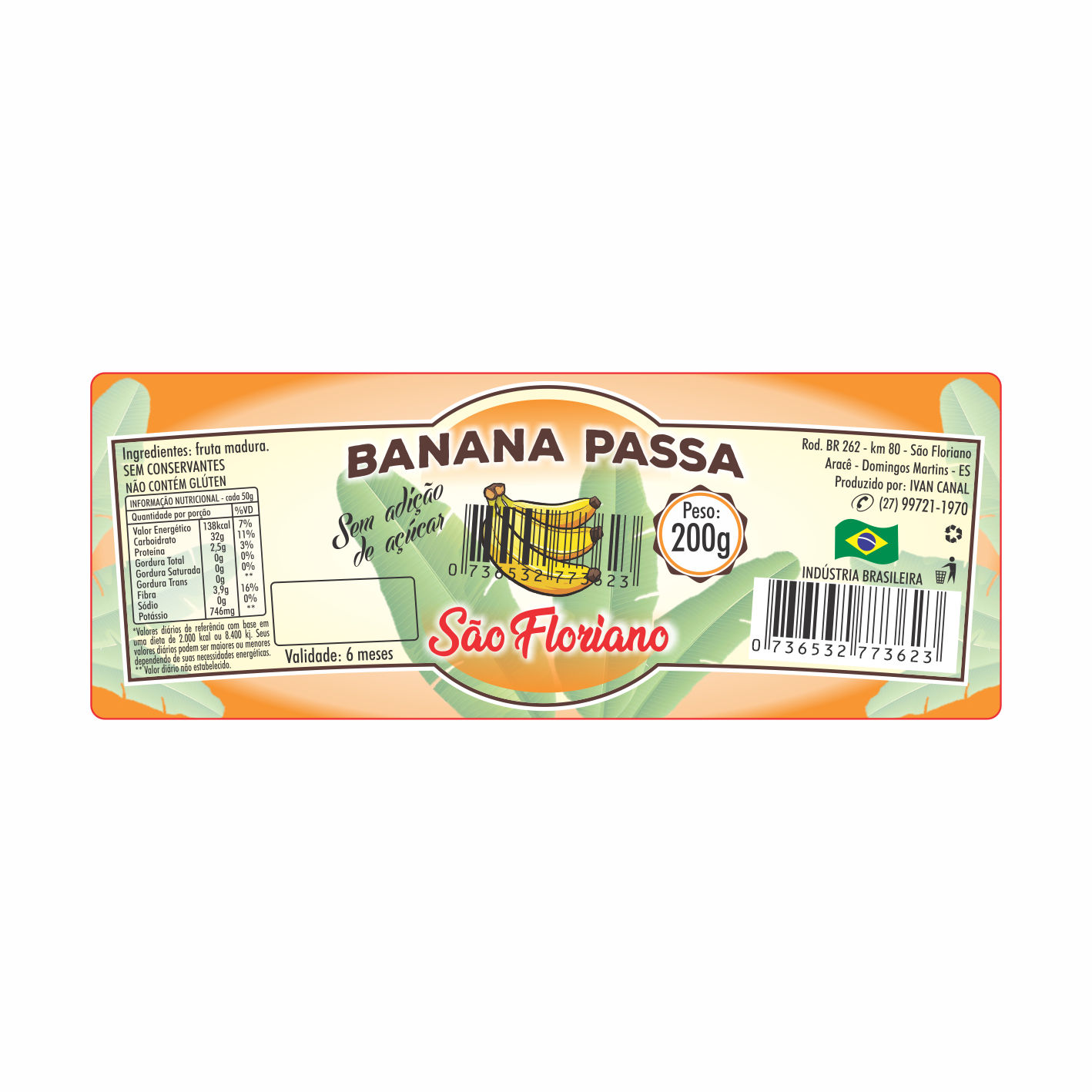 Quant.etiqueta:780Largura :100mmAltura :38mmColunas :01Tipo :RetangularPapel :Couche adesivoVerniz :Sim vazadoCola :RS50Tubete :01´Metragem :32mtsLargura do papel:110mmPersonl Frente:SAO FLORIANO BANANA PASSA 200G COD 0736532773623 VAL 6 MESES