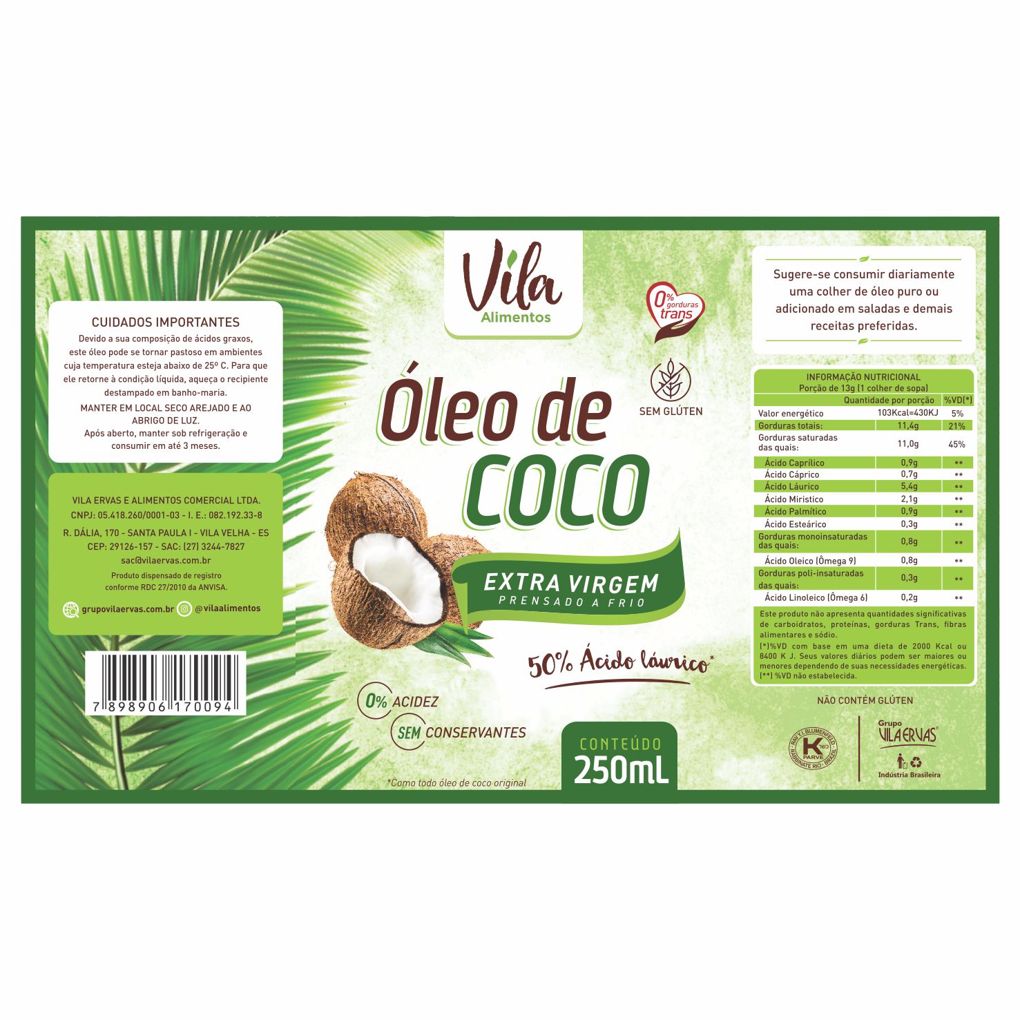 ETIQUETA 100X60/1 PERSONALIZADA BOPP PEROLADO VILA ALIMENTOS OLEO DE COCO 250ML-(1000)K Ref: 18137