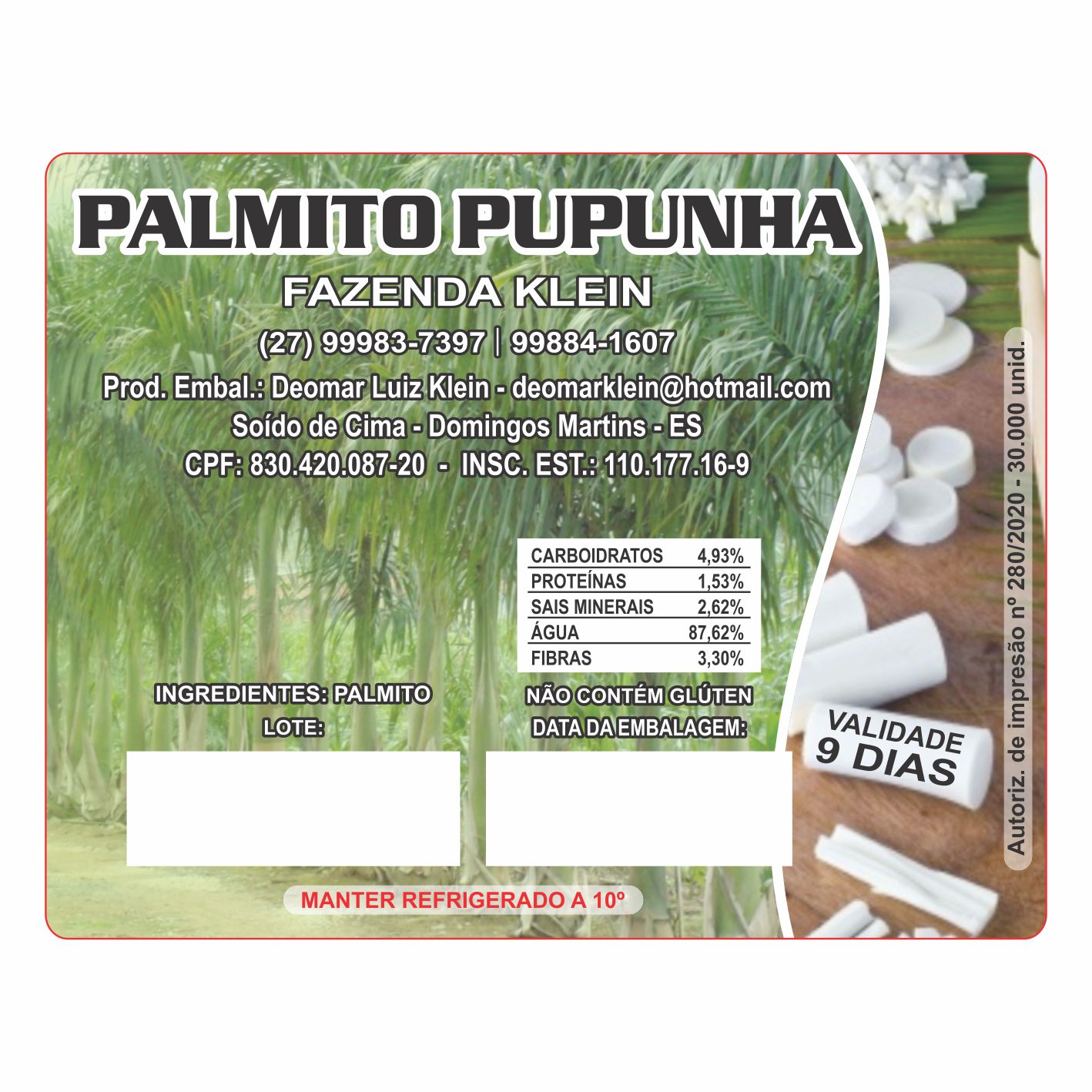 ETIQUETA 100X78,5/1 COUCHE/PALMITO PUPUNHA FAZENDA KLEIN SEM CODIGO DE BARRAS (500UNID)K Ref: 16158