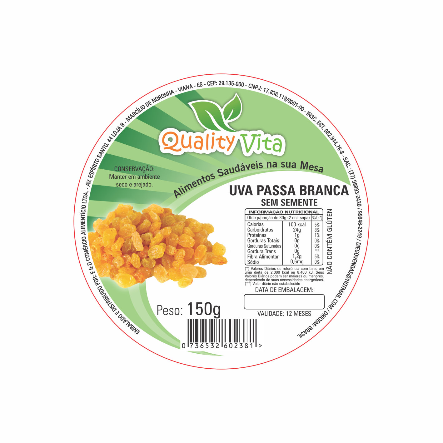 ETIQUETA 80MM DE DIAMETRO COUCHE ADES/QUALITY VITA UVA PASSA BRANCA SEM SEMENTE 150G (500UNID)K Ref: 15825