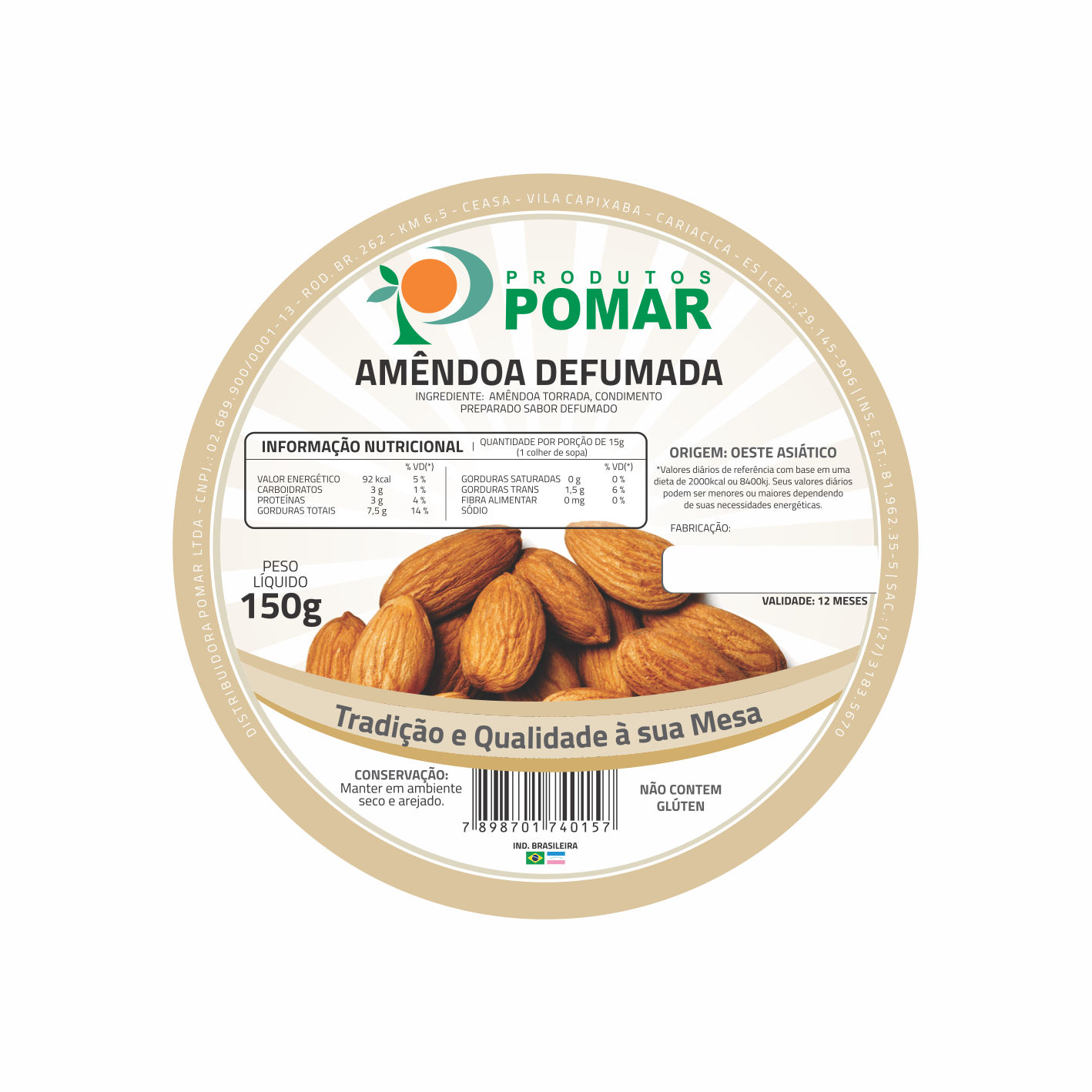 Quant.etiq. :500Largura :80mmAltura :80mmColunas :01Tipo :RedondoPapel :Couche adesivoVerniz :SIM> localizadoTarja :SIMPersonalização Frente:POMAR TEMPEROS AMENDOA DEFUMADA 150G cod 7898701740157 val 12 meses
