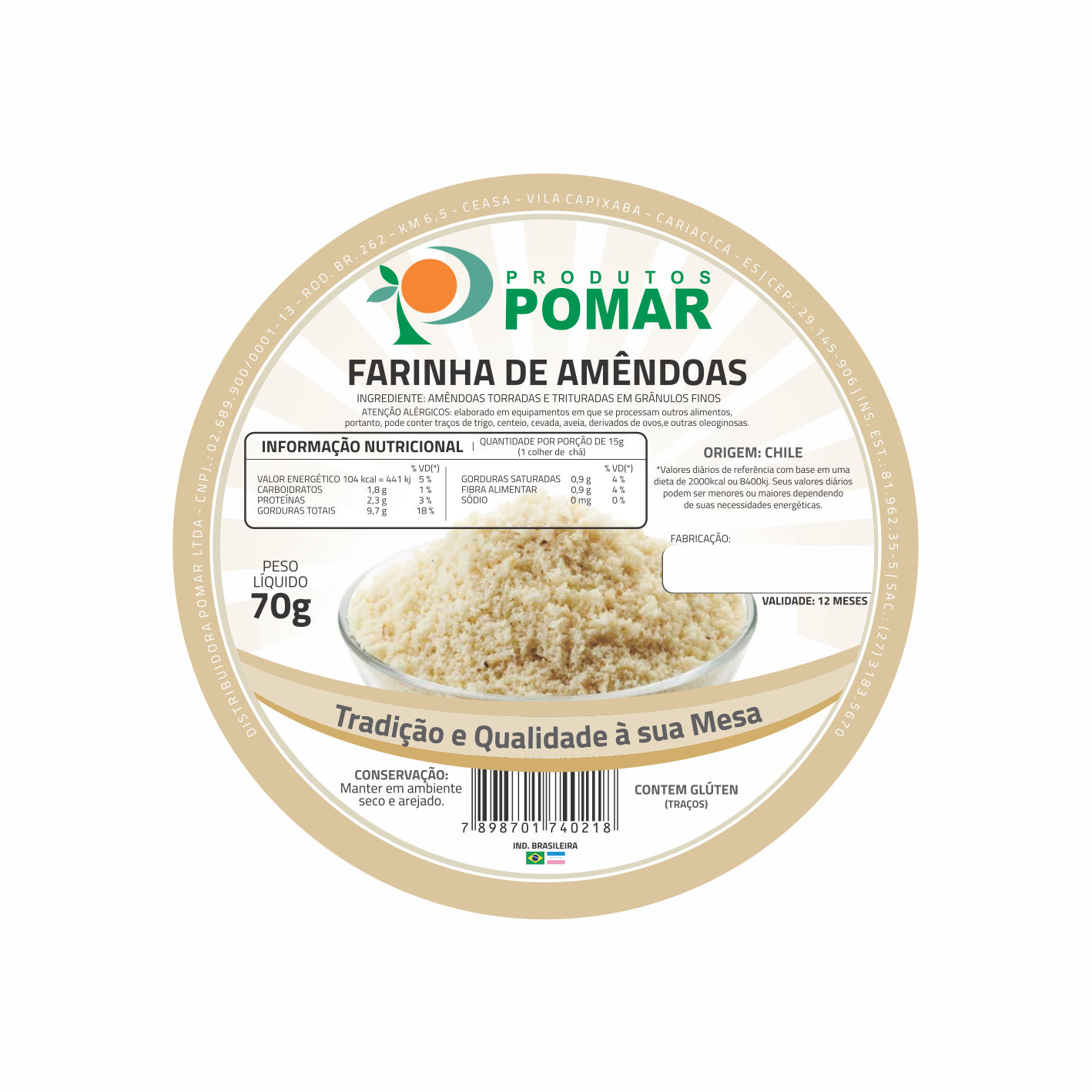 ETIQUETA 80MM DE DIAMETRO COUCHE POMAR FARINHA DE AMENDOAS 70G (500UNID)K Ref: 16745