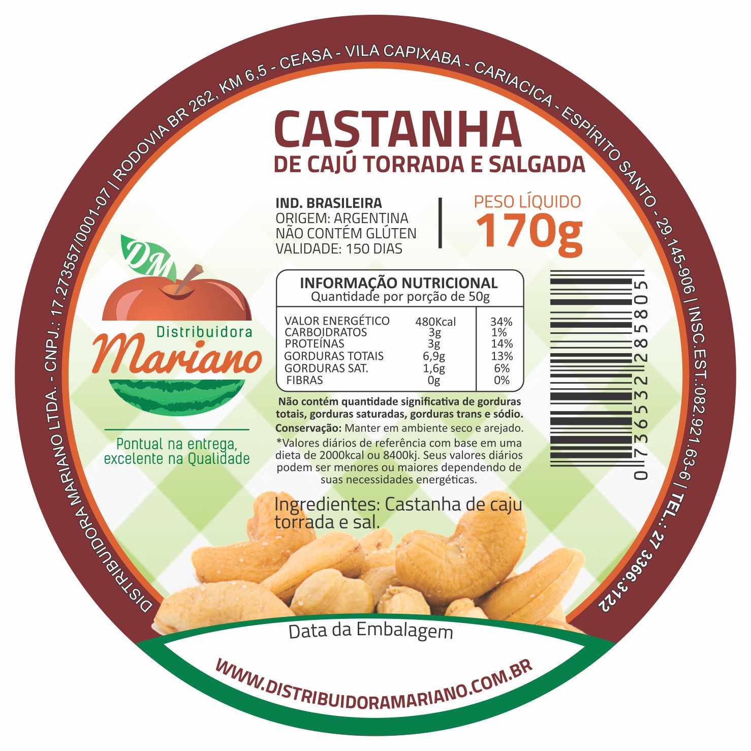 ETIQUETA 80MM DE DIAMETRO PERSONALIZADA/COUCHE ADES/DISTRIBUIDORA MARIANO/CASTANHA DE CAJU TORRADA E SALGADA 170G-42MTS Ref: 15592