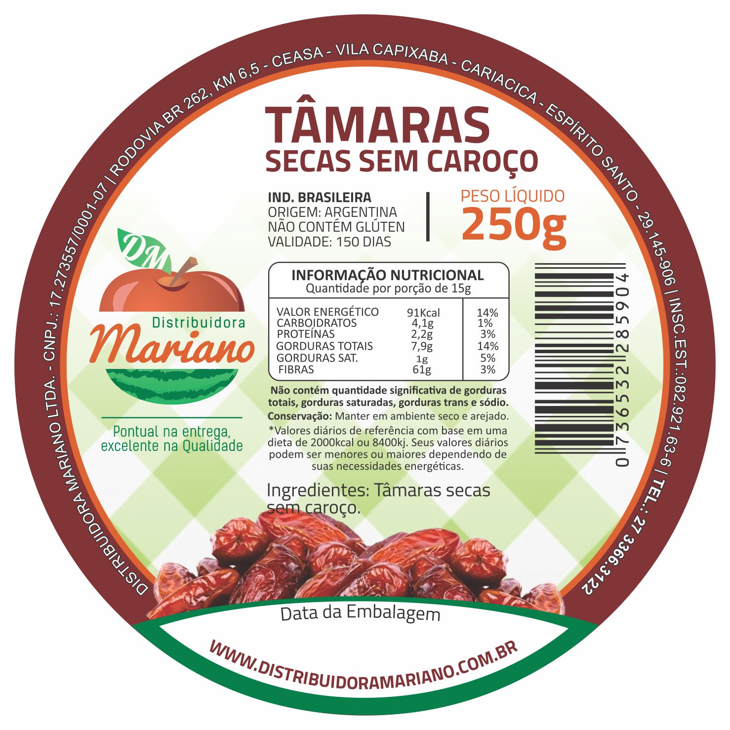 ETIQUETA 80MM DE DIAMETRO PERSONALIZADA/COUCHE ADES/DISTRIBUIDORA MARIANO/TAMARAS SECAS SEM CAROÇO 250G-42MTS Ref: 15597