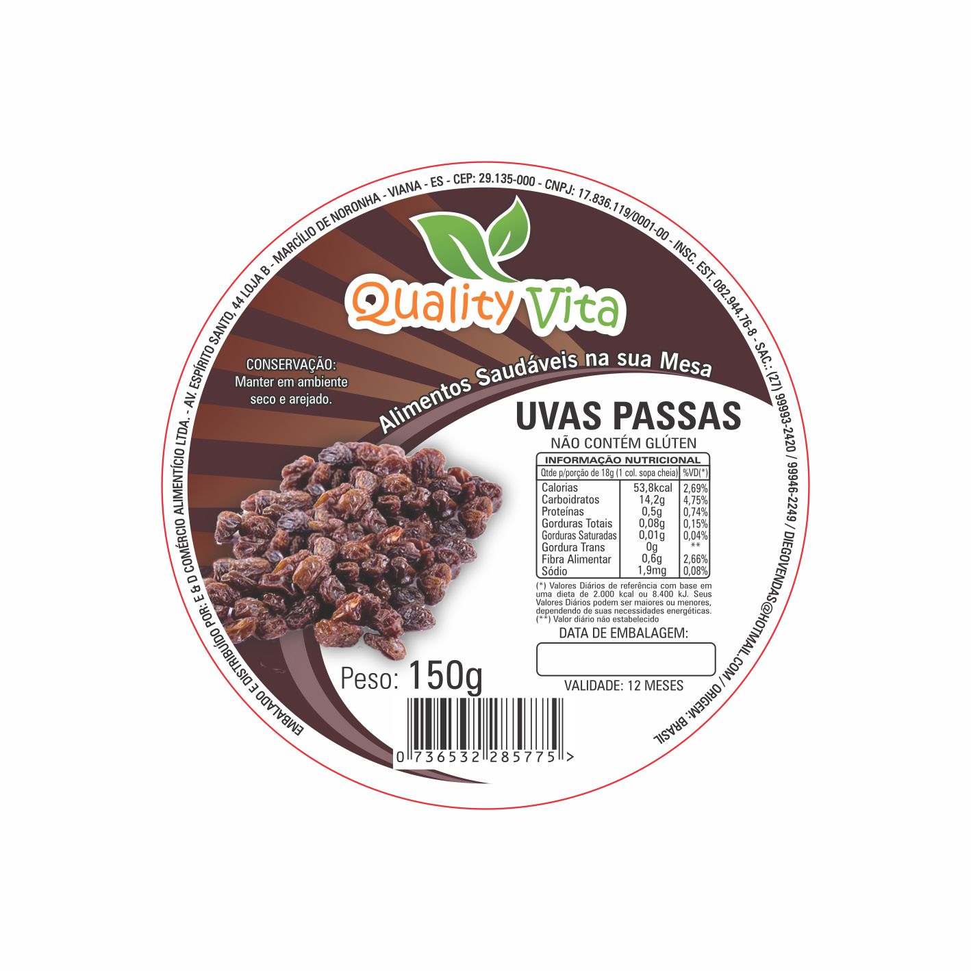 ETIQUETA 80MM DE DIAMETRO PERSONALIZADA/COUCHE ADES/QUALITY VITA UVAS PASSAS 150G-42MTS Ref: 15655