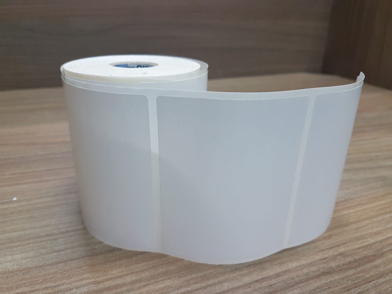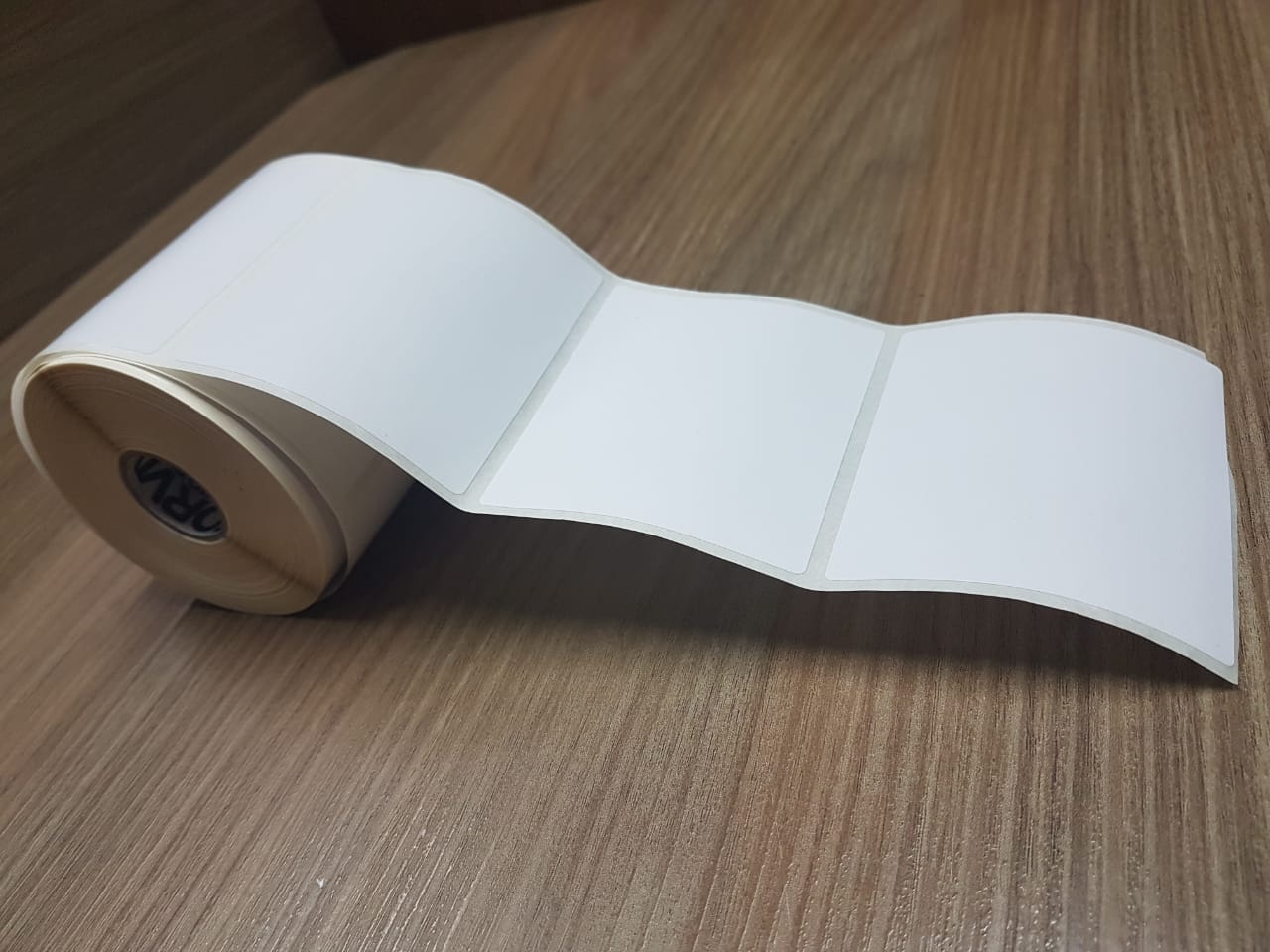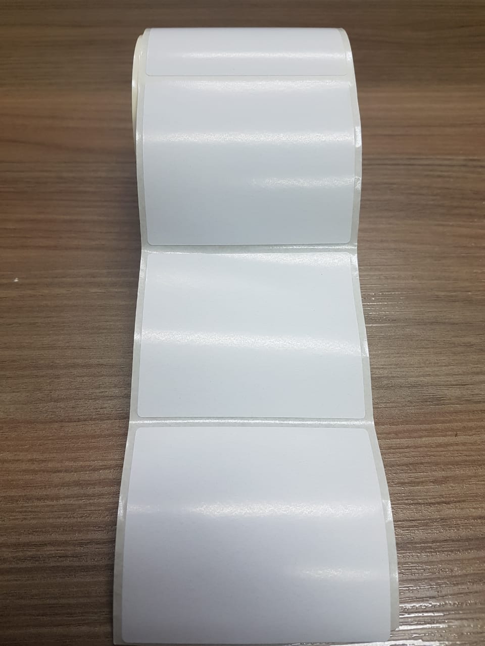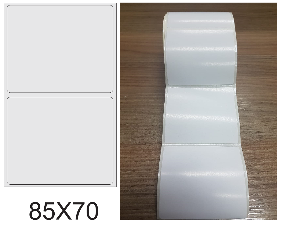 Quant. Etique.: 438 Largura : 85 mmAltura : 70 mmColunas : 01 Material : Couchê adesiva Cor : Branca Tubete : 01 polegadaMetragem : 32mts