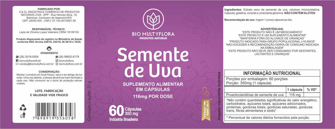 ROTULO 70X180 PERSON BOPP METALIZADO BIOMULTYFLORA SEMENTE DE UVA 60CAPS 350MG ANVISA (1000UNI)K Ref: 18814